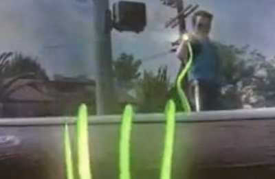 Fire and Atom fly above and look worried, as the Flash rescues a bunch of latch-key kids on the ground. Guy threatens Eno with a chainsaw construct... which only appears to (figuratively) tickle our super villain. Guy demands he hand over the weather manipulator, Eno outwits our Lantern by... throwing the device into the bushes. Ruh-roh.