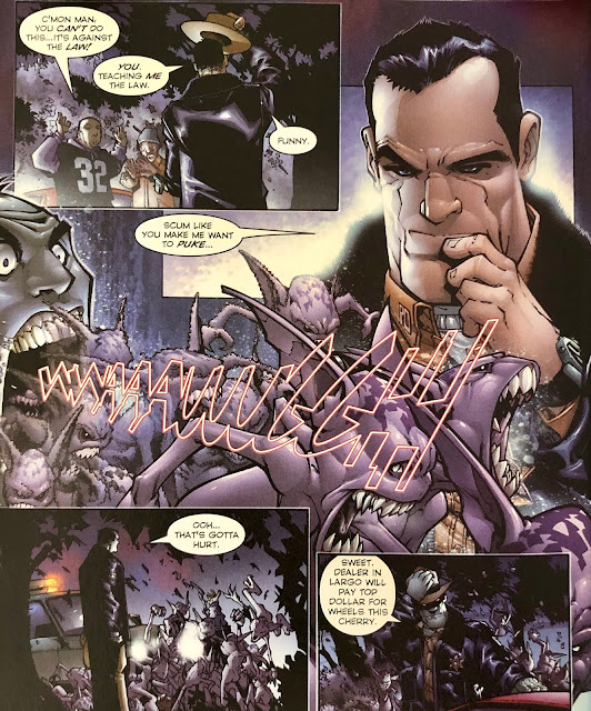 Let's talk art. I know Humberto Ramos can be a bit divisive... but, I've always enjoyed his work. This semi-early work is probably some of my favorite Ramos stuff. The characters (outside of the weird-beard coloring goof on Casey), are all really great looking, and stand out from the rest of the crowd. That's something that usually trips me up when reading a book full of "normal" people. It's hard to make them look distinct... with maybe a little bit in the way of "cartoonish" identifiers, without making them look like costume shop models. Ya know what I mean? Does that make sense?