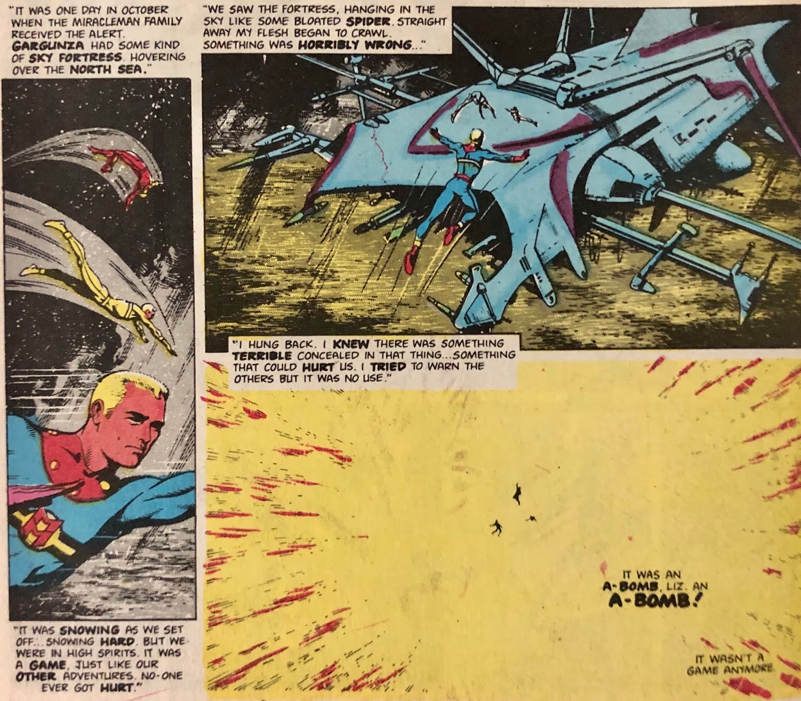 Mike regains his composure and continues his story. One day, in October, 1963... everything changed. Ya see, up until this point, the Miracleman Family adventures were very much "Silver Age Silly". Ya know, high stakes... yet at the same time, no stakes... ya dig? Then, the Fam was hit with an Atomic Bomb!