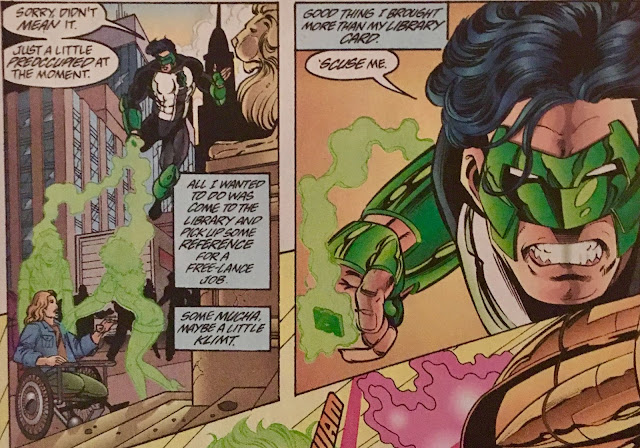There's that one cutaway to the man with the construct legs at the Statue of Liberty... and man, it's driving me nuts that I can't remember anything about this! I feel kinda foolish for suggesting it could've been a long brewing deal with Kyle handing off his powers bit by bit, when it was actually dealt with in the very next issue! Whatever the case, I'm pretty intrigued!