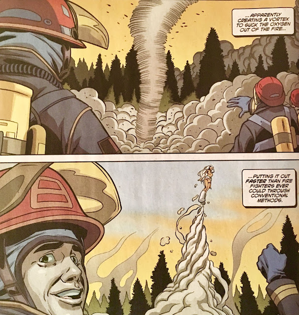 Then, there's Sirocco, who controls the element of Air.  She whips up a cyclone to draw all of the oxygen out of the fire... putting it out faster than any fire fighter could ever hope to.